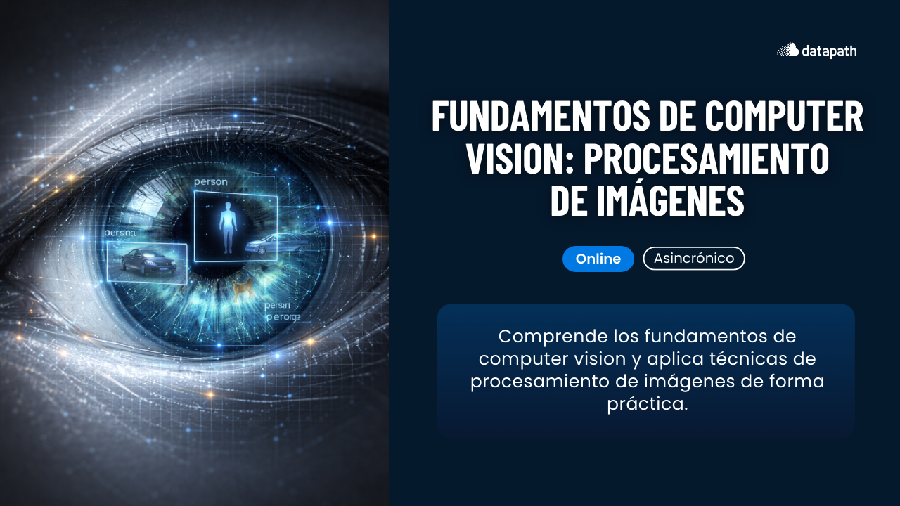 Aprende Computer Vision desde fundamentos hasta aplicaciones avanzadas. Domina procesamiento de imágenes digitales, extracción de características, clasificación con Machine Learning, detección y segmentación de objetos con Deep Learning, análisis de movimiento, seguimiento de objetos y geometría computacional con modelos pinhole. Incluye aplicaciones prácticas de IA en visión artificial.