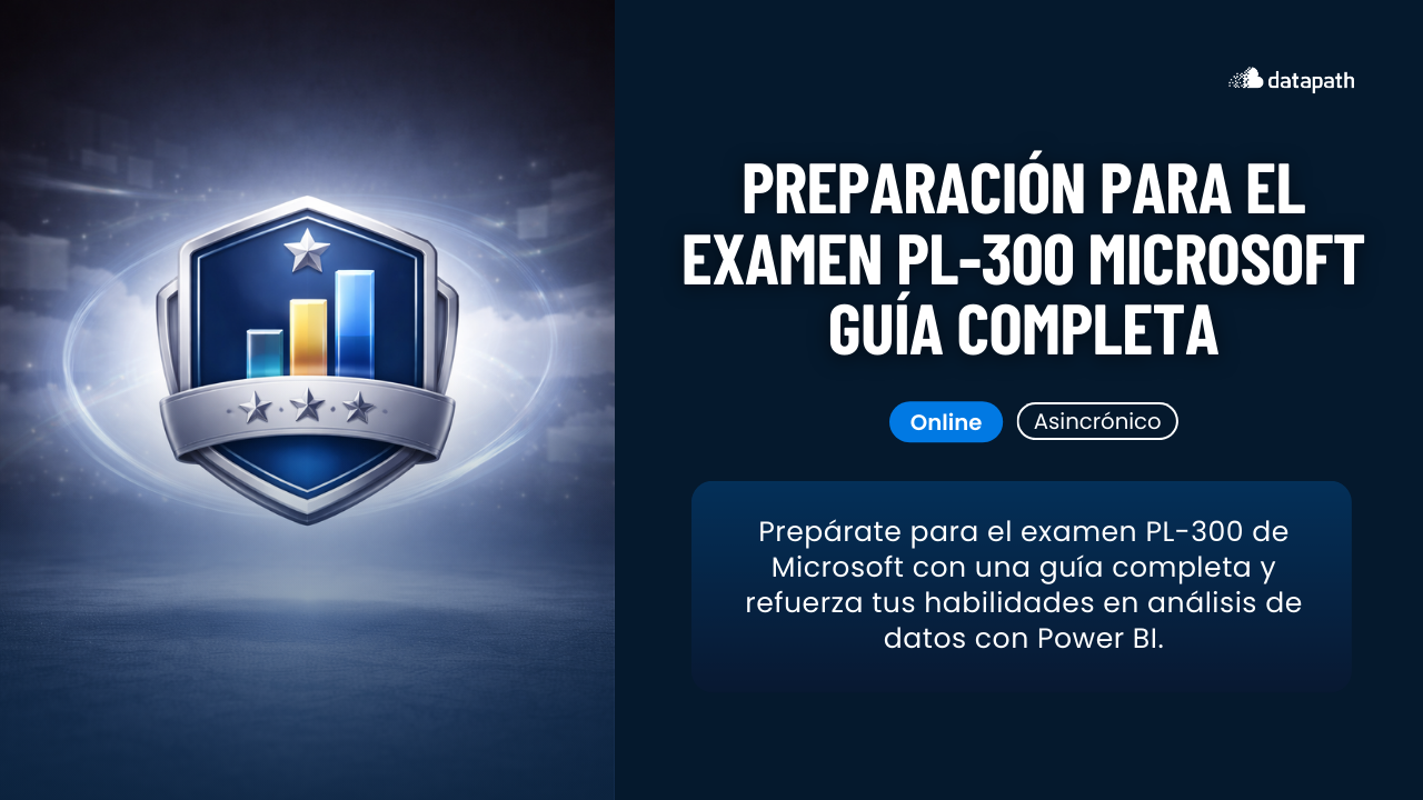 Prepárate para la certificación PL-300 Microsoft Power BI Data Analyst. Domina preparación y transformación de datos con Power Query, modelado (esquemas estrella, DAX, medidas de tiempo), visualización de reportes interactivos, configuración de áreas de trabajo, seguridad a nivel de fila, actualización de datasets y administración de puertas de enlace.