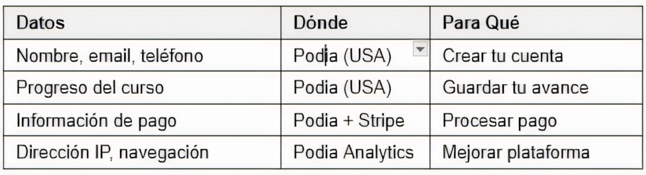 Financieros: Información de pago (procesada por Podia/Stripe, no la almacenamos directamente)