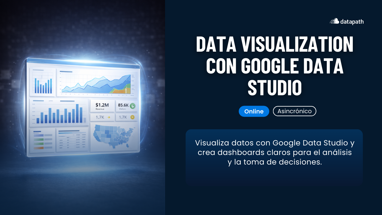 Aprende Google Data Studio (ahora Looker Studio) para visualización de datos. Domina conexión de fuentes (Google Sheets, BigQuery, Analytics, Google Ads), creación de informes interactivos, gráficos (líneas, tablas, mapas, donas), campos calculados, métricas personalizadas, diseño de dashboards profesionales y compartir reportes en tiempo real. Ideal para contar historias con datos.